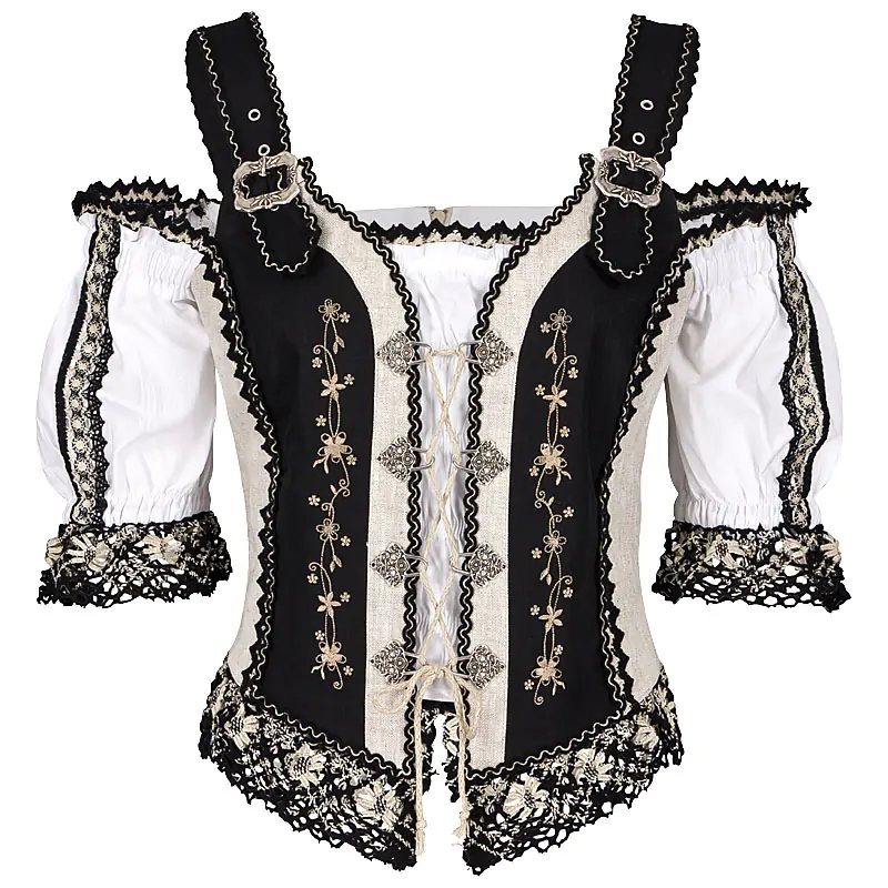 - Dirndlblusen, welche unter Dirndlkleidern sitzen, werden sauber zentriert, sodass die Ärmel gleichmäßig seitlich abstehen.