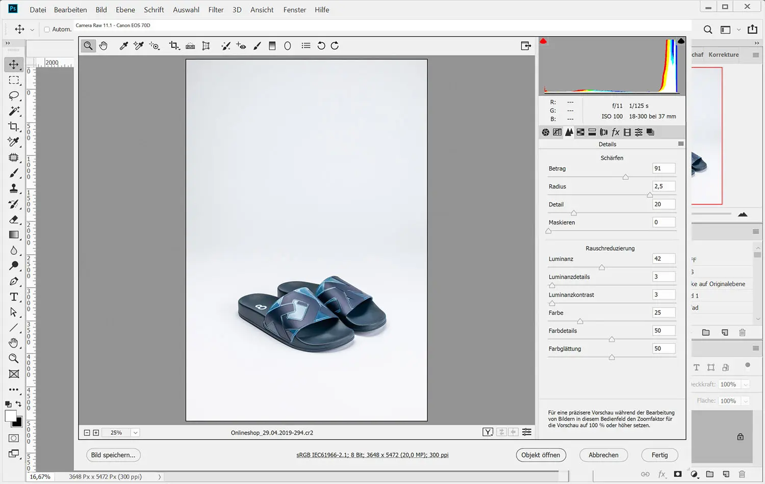 Zwischen einer einfachen JPG-Fotoaufnahme aus der Kamera und einem am Computer aus dem Rohdatenformat entwickeltem Produktbild gibt es deutlich sichtbare Unterschiede.