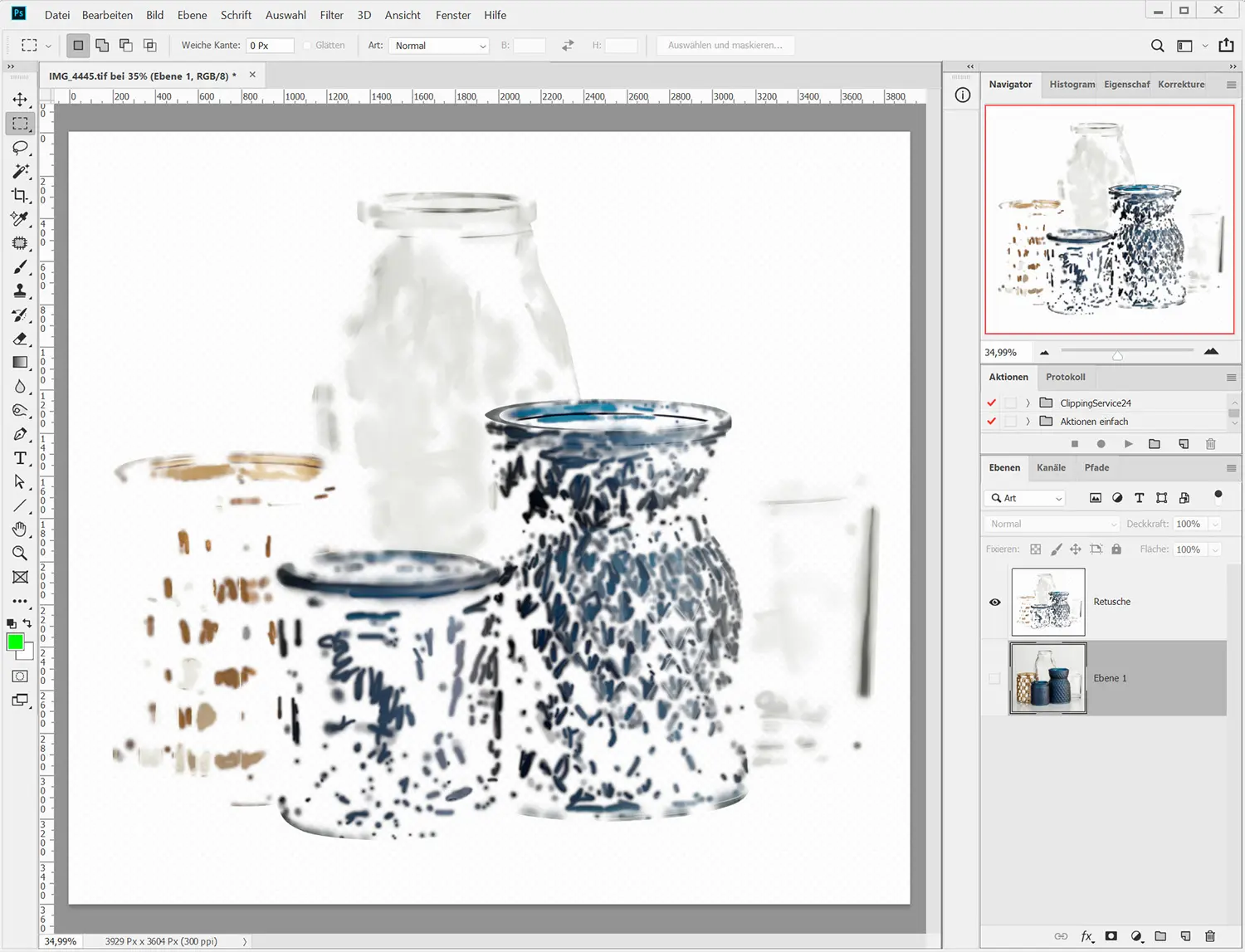 Bildretuschen erfordern einen deutlich höheren Zeitaufwand für Detailarbeiten, sobald es sich um Objekt-verändernde Retuschen handelt. Hierbei ist von entscheidender Bedeutung, dass vergleichbare Bildelemente gefunden werden, die dann per Kopierpinsel präzise an eine andere Stelle übertragen und nahtlos eingepasst werden können.