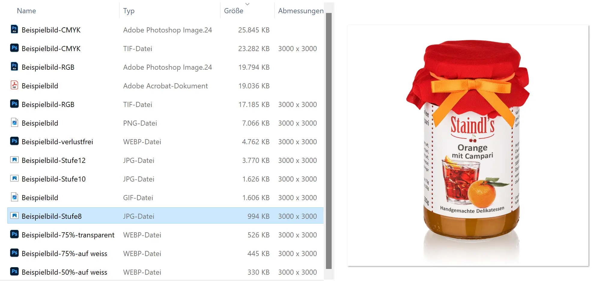 - Zur Verwendung im Internet und als Vorschaubilder liefern wir JPG-Bilder mit einer Komprimierungsstufe von 8 bis 10 aus.